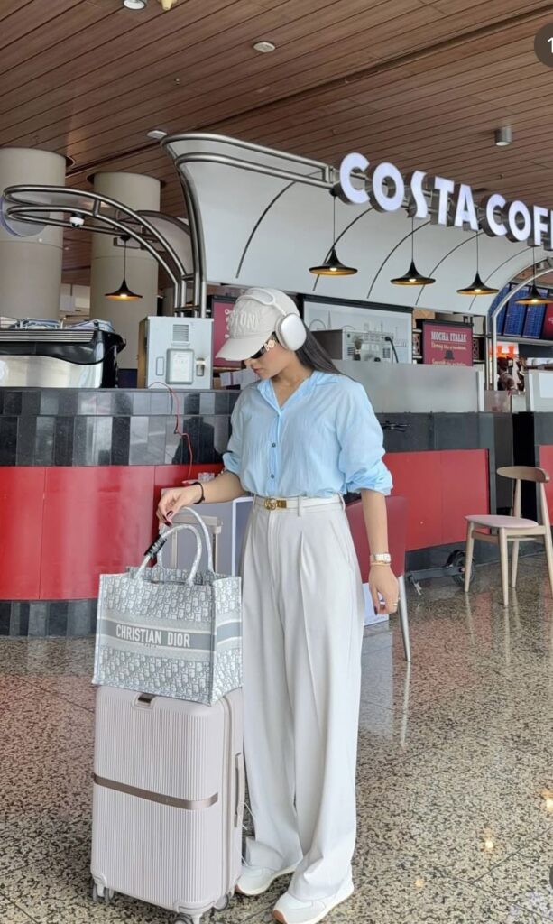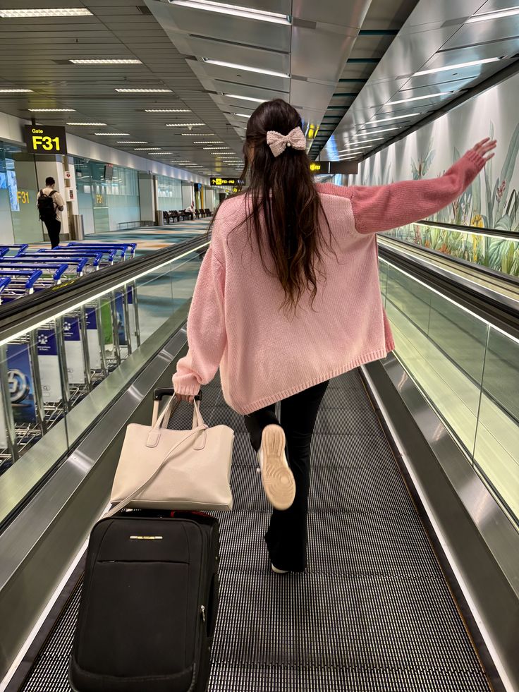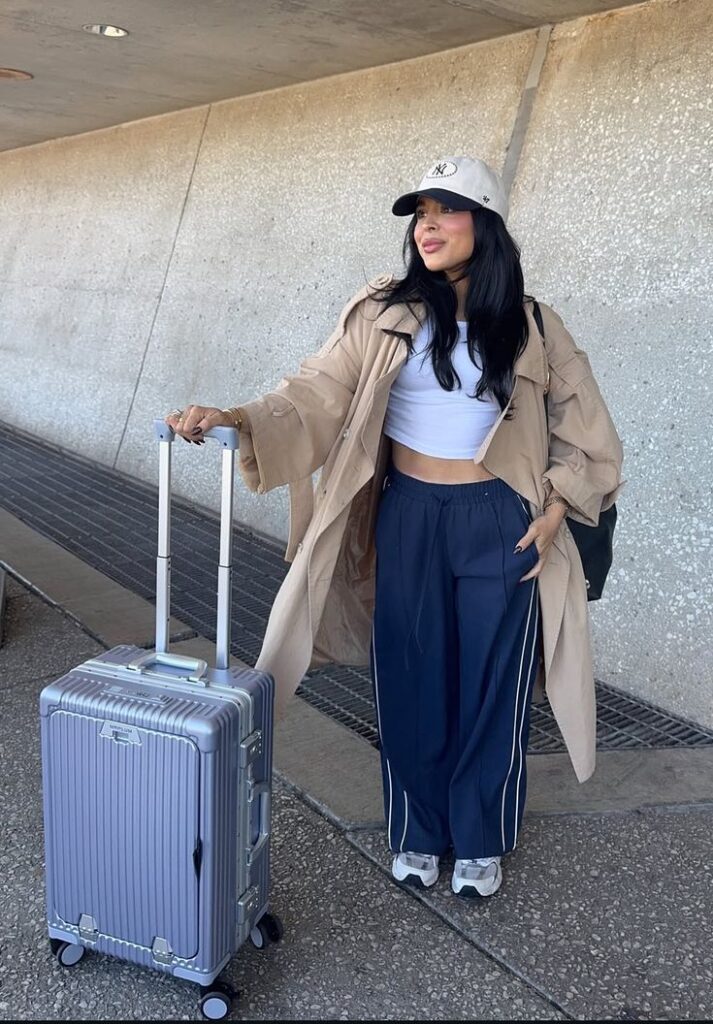 Matching your luggage to your color scheme is next level coordinated. This outfit makes you feel good, which honestly matters when you’re dealing with the stress of travel, and looking polished can genuinely improve your entire airport experience.