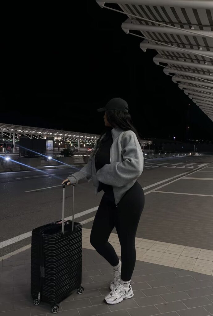 This outfit type is perfect for long haul flights because the stretchy fabric moves with you but the structured jacket keeps everything looking intentional instead of sloppy.