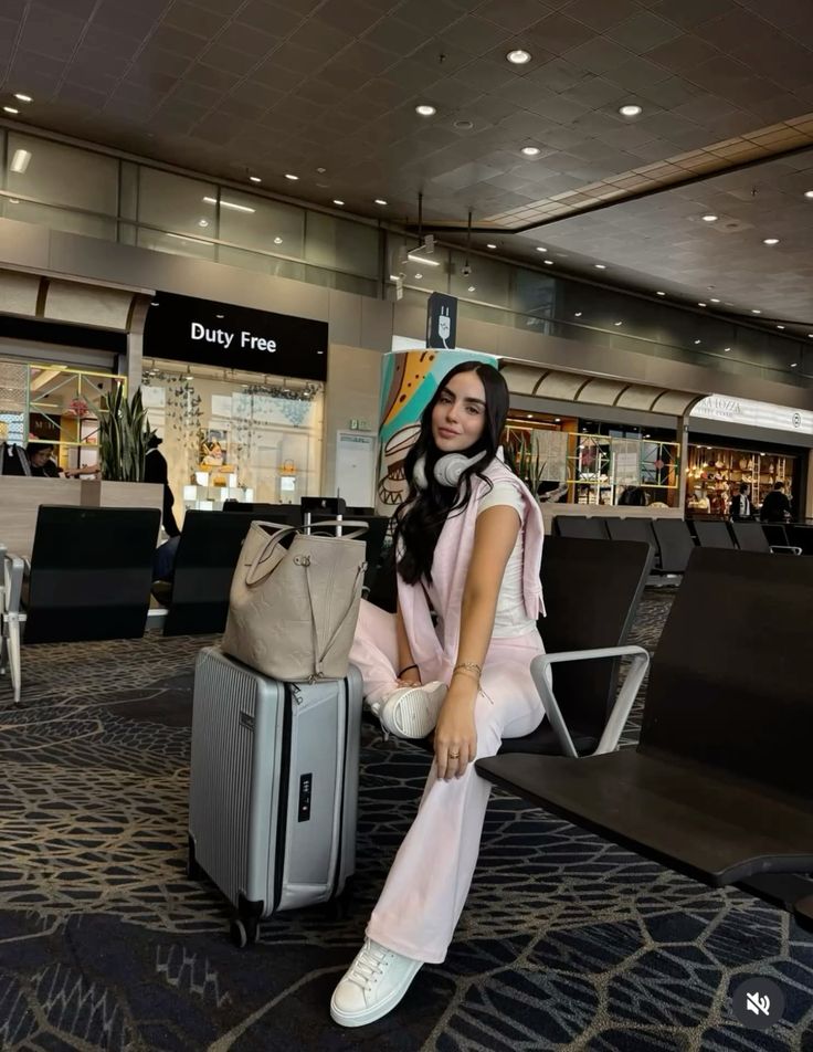 The cream luggage ties it all together. This is perfect for spring or summer travel when you want that vacation energy to start the moment you walk into the airport.