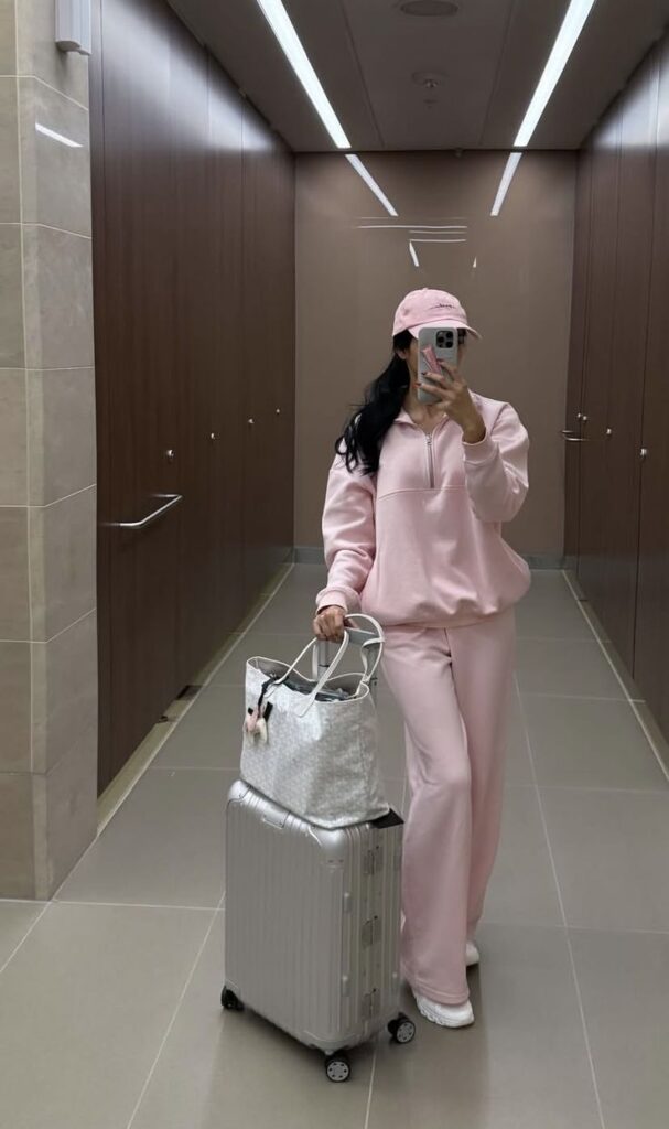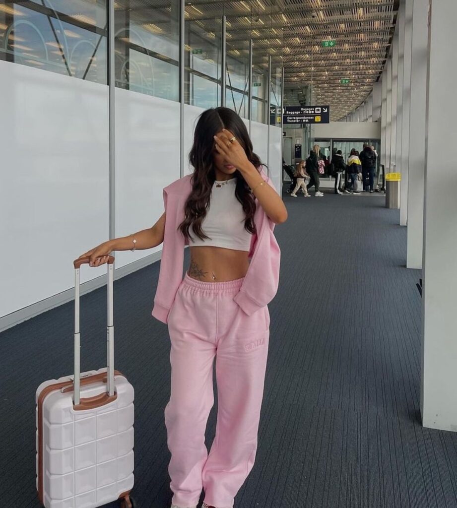 Matching sets are literally made for travel days. A pink sweatsuit with the half zip hoodie and joggers keeps you so comfortable during those long flights. The baseball cap hides any bad hair situations.