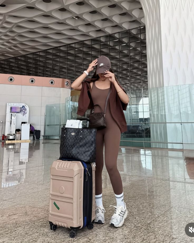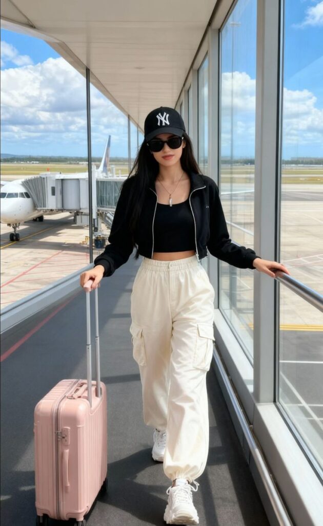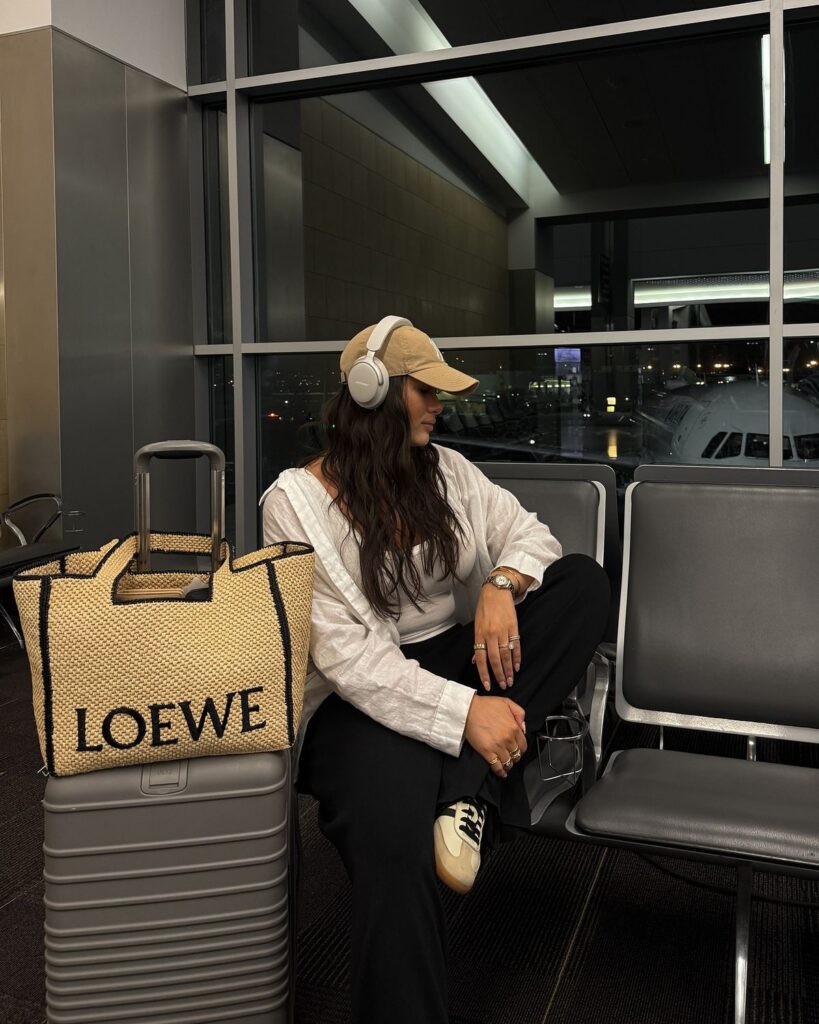 Add a baseball cap and designer tote for that elevated traveler aesthetic. Headphones around your neck show you’re ready to tune out during the flight.