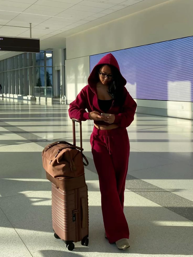 Deep wine colored hoodies paired with matching joggers feel so cozy for those cold airport terminals.