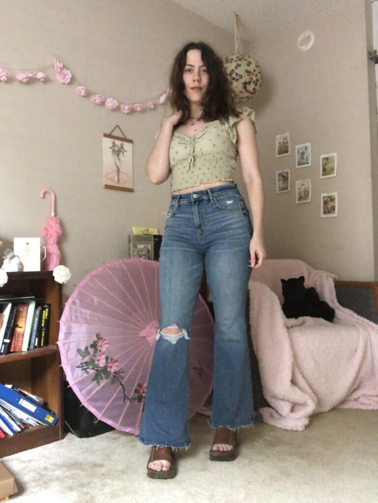 The ruffle sleeved floral crop is such a dreamy pairing with the wide leg AE curvy fit. The vintage inspired wash on the denim complements the soft sage green top without competing with it at all. Platform sandals ground the whole look and add enough height to balance the flare. This is honestly the summer outfit for girls who love feminine details but still want jeans they can actually move in.