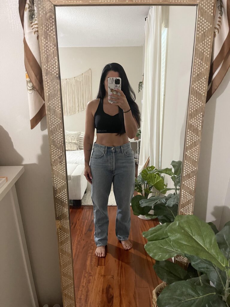 Okayyy so pairing a sleek black racerback crop with the straight curvy fit is surprisingly stylish and so easy to recreate. The high waist sits beautifully here and the clean light wash keeps everything looking fresh. I mean this reads effortless in the best way. Throw on a linen overshirt and some slides and you have a complete look that took five minutes maximum.