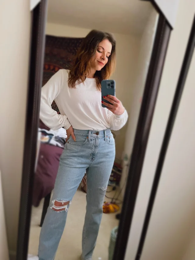 There is something so classically appealing about a white long sleeve tee tucked loosely into light wash straight leg mom jeans. It reads clean, intentional and genuinely timeless. The knee rips add texture without making it feel try hard. This is the outfit for anyone who wants to look pulled together without actually spending more than three minutes getting dressed.
