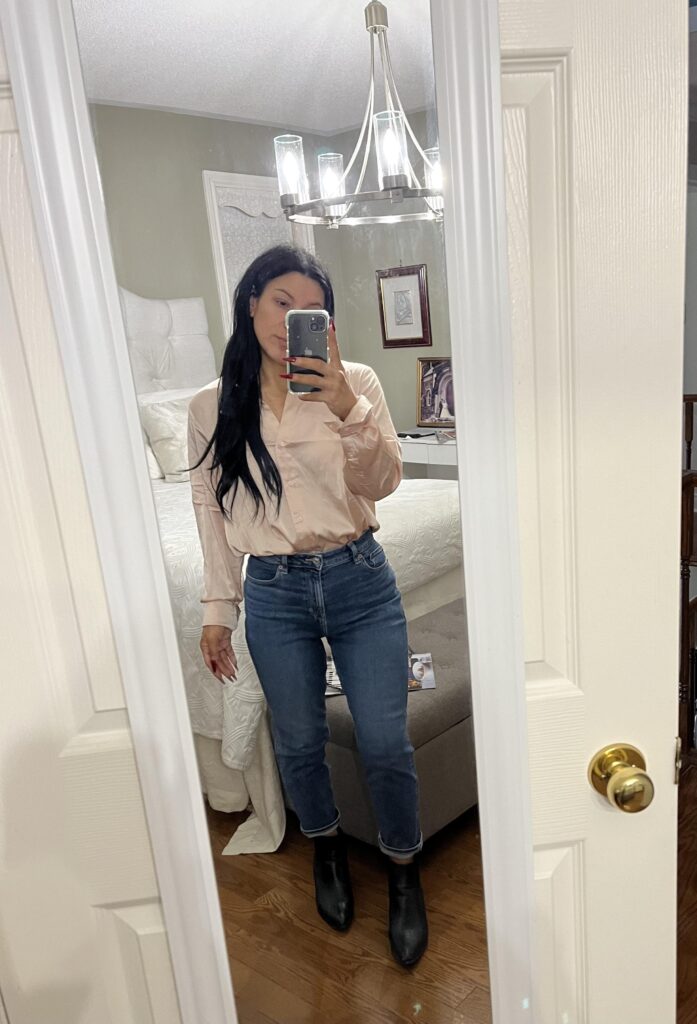Tucking a blush satin button down into mid wash slim mom jeans and finishing with black ankle boots is giving elevated casual in such a satisfying way. The satin fabric lifts what could easily be a basic combo into something that reads polished and thoughtful. I mean the colour contrast between the soft pink and the denim is genuinely perfect. This works for date night as much as it does for lunch with friends.