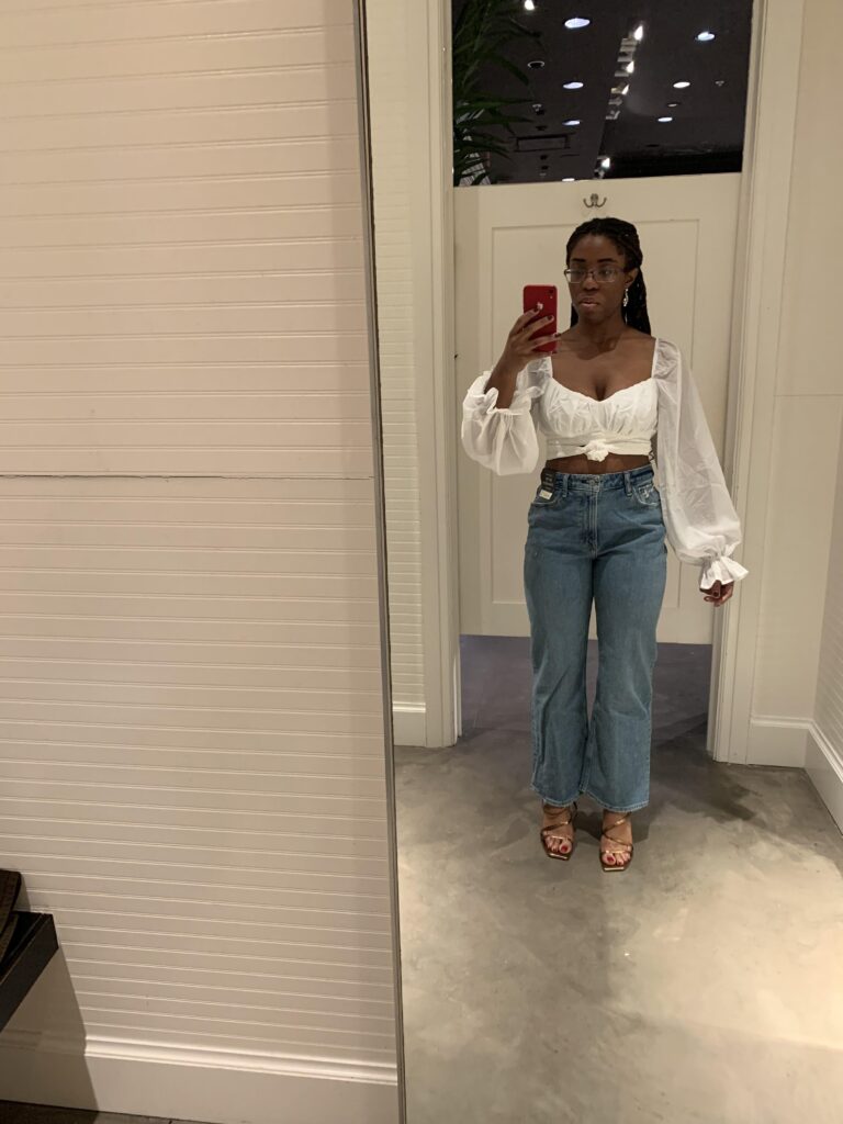 The combination of a white billowy crop top with the curvy wide leg mom jean is so romantic and elevated it almost does not look like jeans at all. The volume on the sleeves balances the relaxed fit of the denim in the most flattering way. Strappy gold heeled sandals take this from casual to dinner worthy instantly. Honestly this is the kind of outfit that photographs beautifully and feels even better in person.