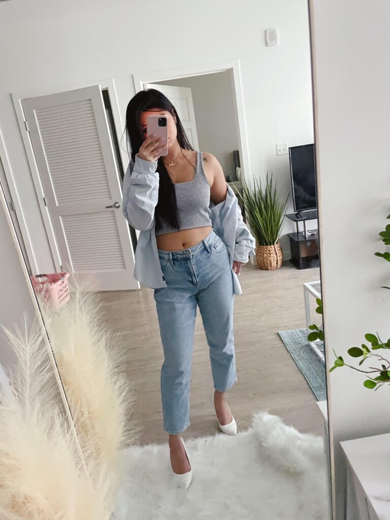 Layering an oversized powder blue button down open over a grey ribbed crop with straight cropped mom jeans and white mules is such a smart casual formula. The colour palette is so cohesive it almost looks planned, which it basically is, and that is the point. White pointed mules dress it up just enough. So easy to recreate and so repeatable with different colour combinations.