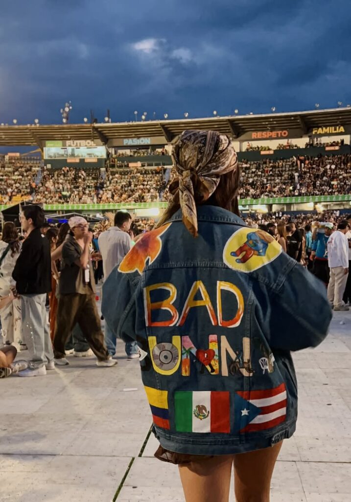 Hand painted denim with Bad Bunny artwork, flags, and a silk headscarf? I mean this is not an outfit, this is a love letter.