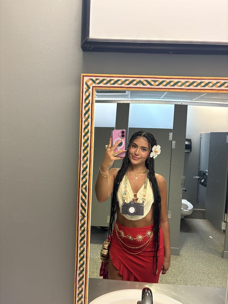 The embroidered red wrap skirt with a cream halter top and layered gold chains is giving festival goddess.