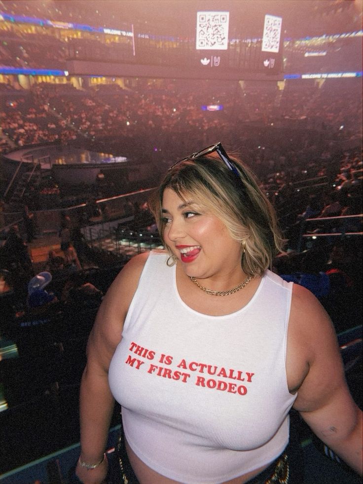 “This is actually my first rodeo” printed across the front at a Bad Bunny concert is sending me.