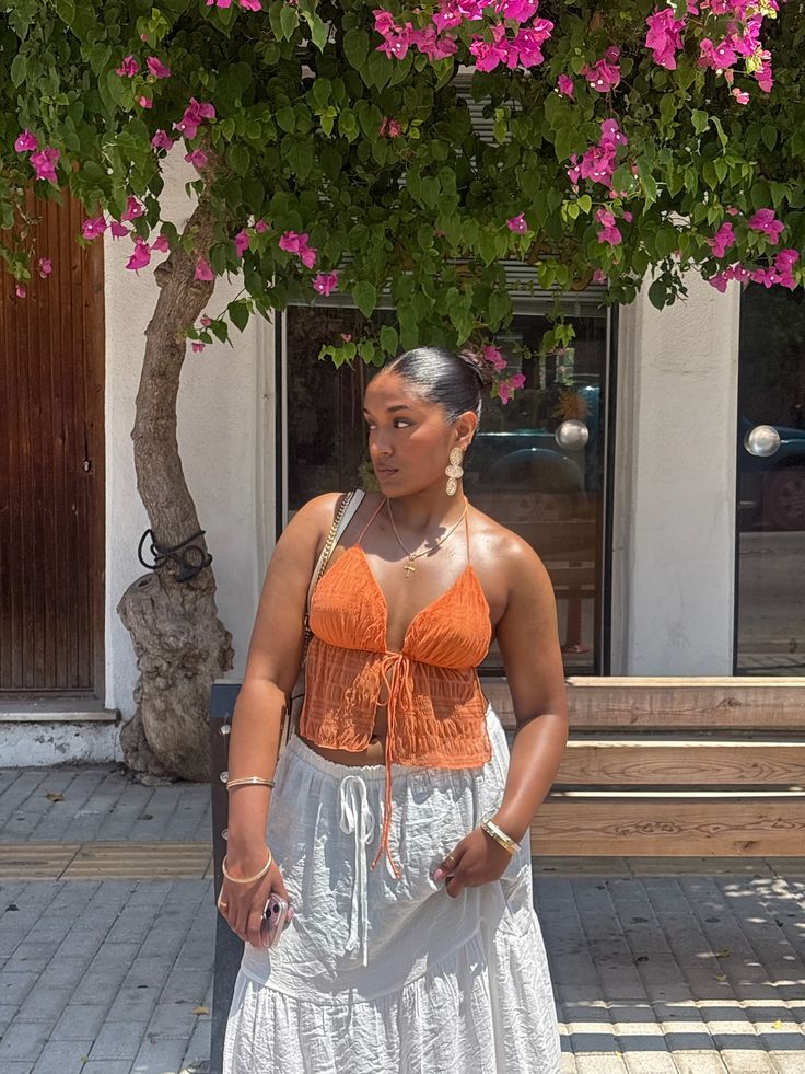Pairing a bright orange ruched top with a flowing white skirt creates this incredible contrast that feels fresh and unexpected, you know?