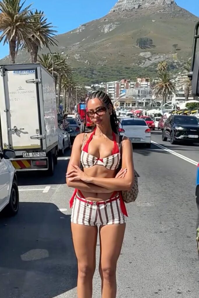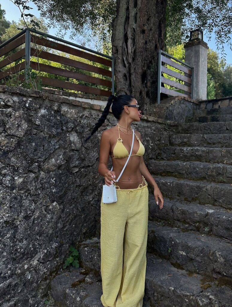 The flowy wide leg pants in that pretty olive tone create this beautiful silhouette that’s both comfortable and elegant, while keeping the bikini top maintains that relaxed vacation energy.