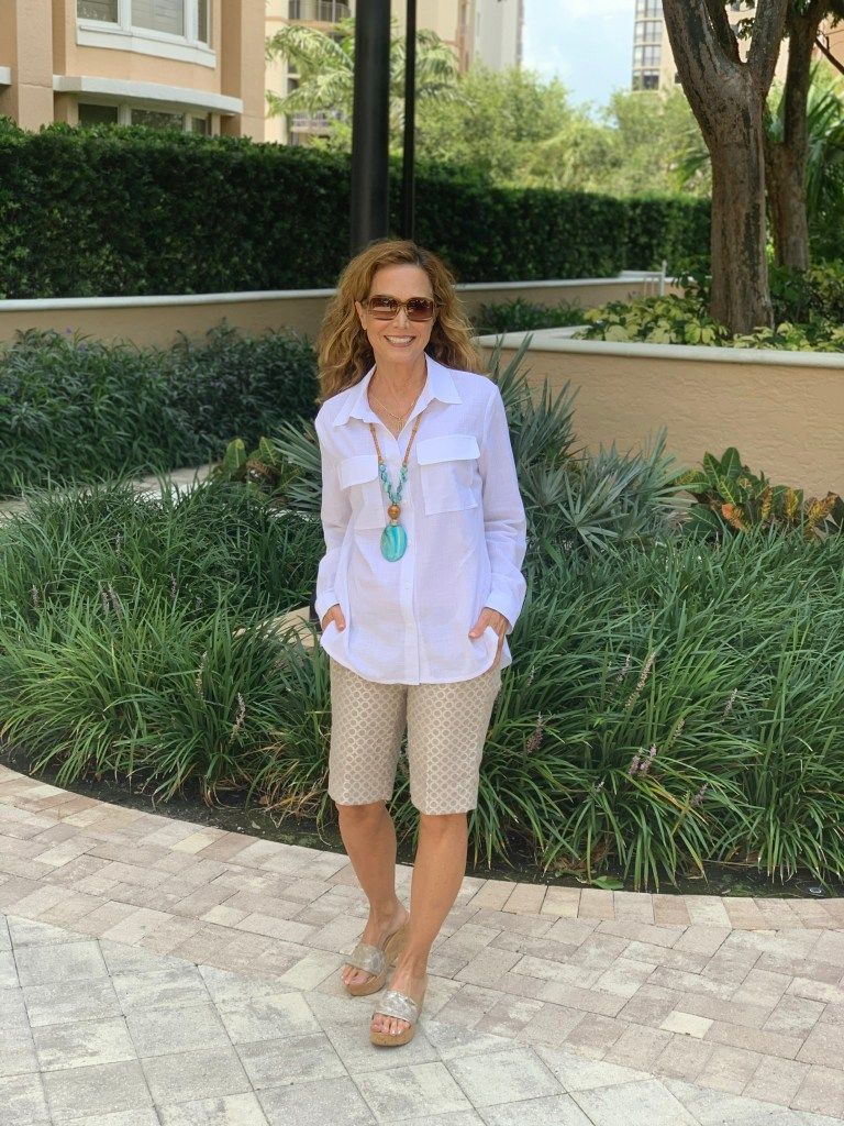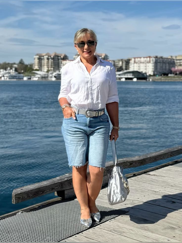 The crisp white linen shirt tucked into light wash denim shorts creates such a clean, timeless look. As you can see the brown belt also adds structure and keeps everything looking polished instead of sloppy.