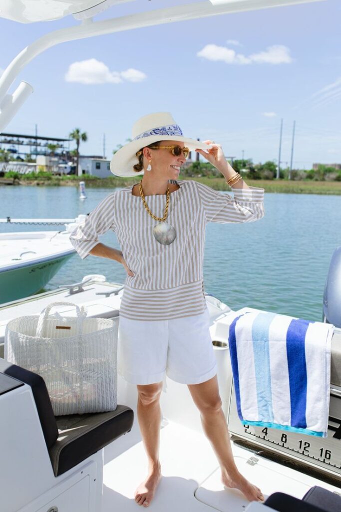 Going barefoot on the boat is totally the move, honestly, because you get better grip and it’s way more comfortable. That striped top provides just enough coverage while still being breezy and cool.