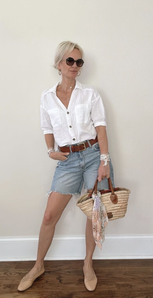 So here’s a styling trick that instantly elevates basic denim shorts – add a perfectly crisp white linen button down. The way those rolled sleeves look is so casually elegant without being stuffy or overdone.