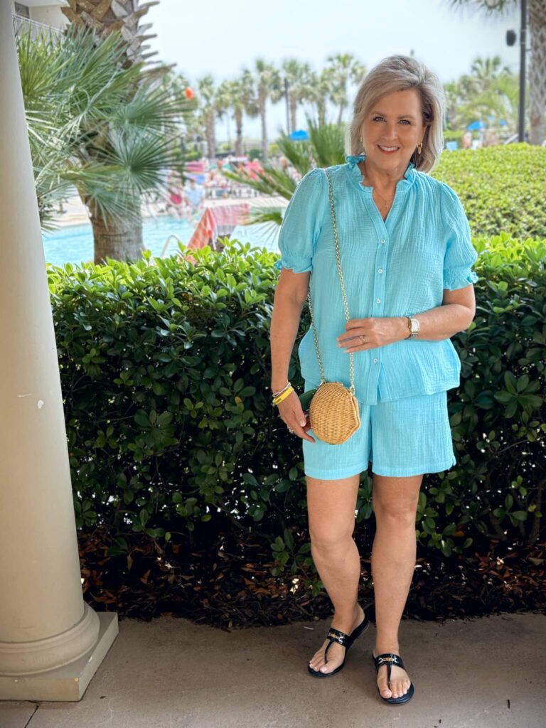 This turquoise gauze set with the button front top and shorts creates a cohesive look without any thought required. The puff sleeves add a feminine touch that’s really pretty without being too fussy or over the top.