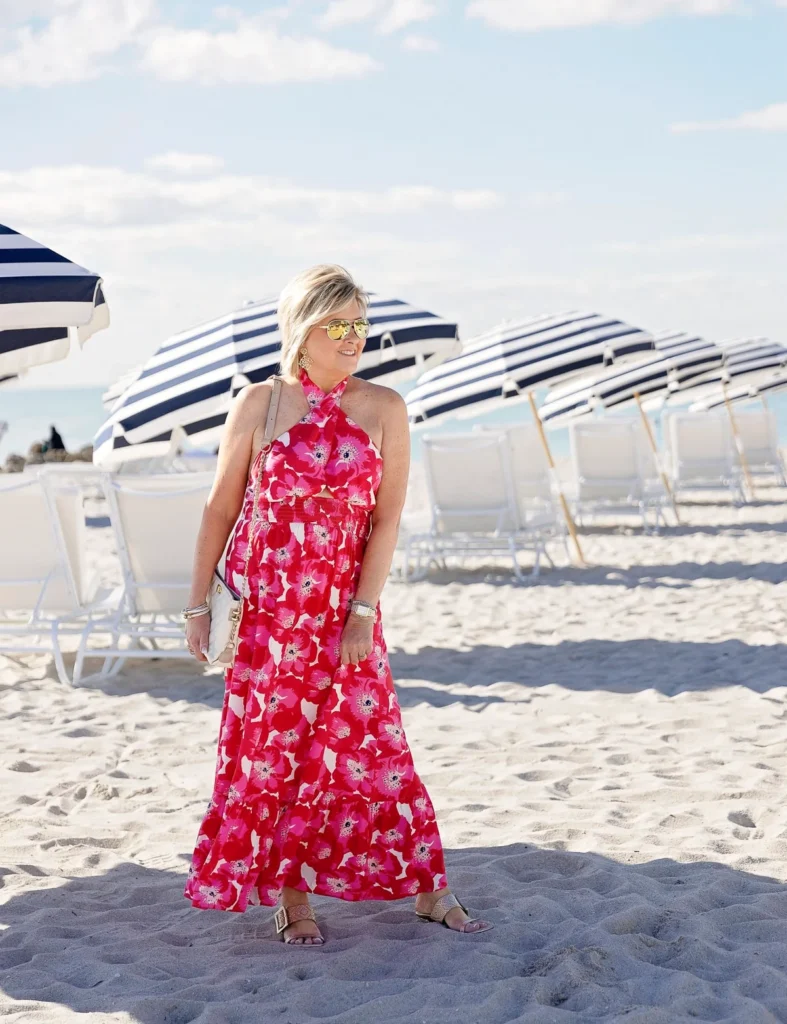 If you’re gonna wear florals to the beach, just make them really bold and vibrant. This hot pink floral dress with the tiered skirt has so much movement and joy built right into it.