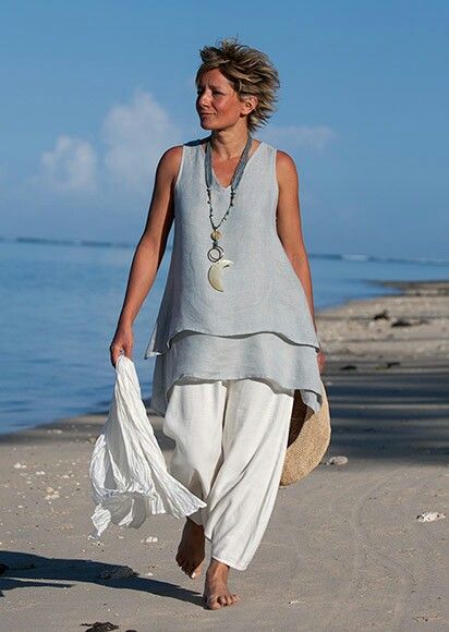 That gray layered tunic over white wide leg pants provides coverage while still keeping you cool.