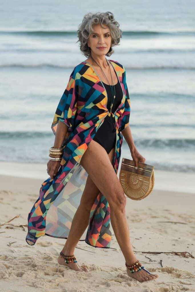 The geometric print adds so much visual interest while the black swimsuit provides a sleek base that anchors everything. The way the kimono flows creates beautiful movement when you walk along the beach.