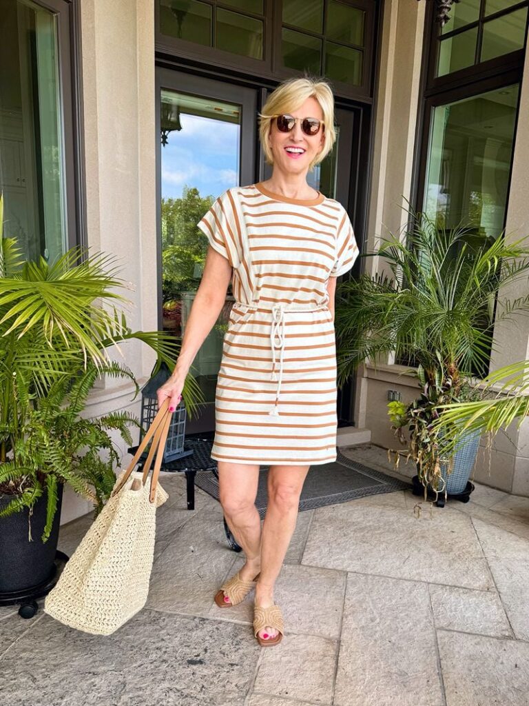 Who doesn’t love a good stripe situation? This caramel and white striped dress with the tie waist is so flattering because it defines your shape while still keeping things breezy and comfortable.
