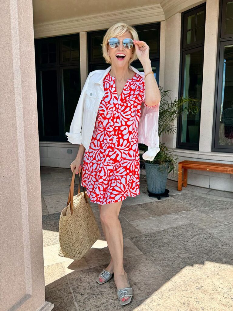 You know what’s genius? Throwing a white denim jacket over a vibrant red print dress because it instantly makes the whole look more casual and approachable.