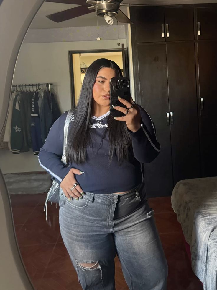 That navy graphic crop with grey ripped jeans is giving early 2000s energy but in a totally current way, and the silver bag slung across the body is such a smart contrast against the dark tones.