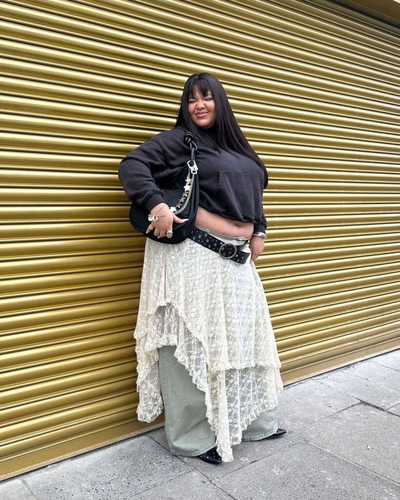 Layering a lace skirt over wide leg jeans is the kind of move that sounds chaotic on paper but lands so perfectly in real life.