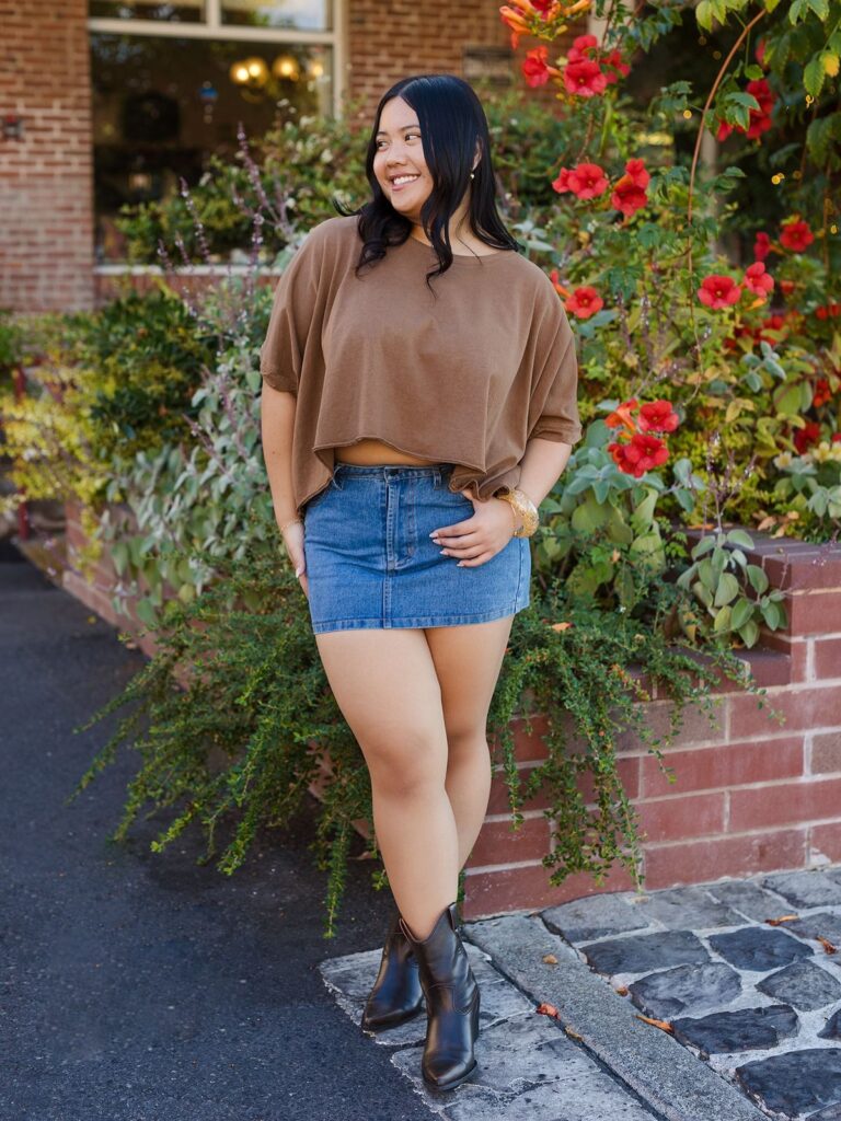 The brown oversized crop with a denim mini is so effortlessly cool, and swapping out sandals for black ankle boots totally shifts the vibe from summer casual to something more intentional.
