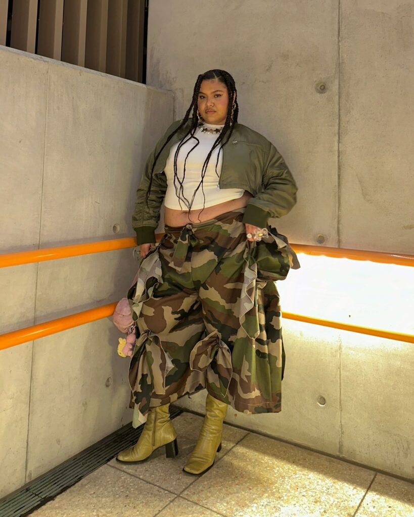 The layered camo pieces with that olive bomber keep things cohesive without looking like a costume, and those yellow boots are so unexpected they basically make the whole look.
