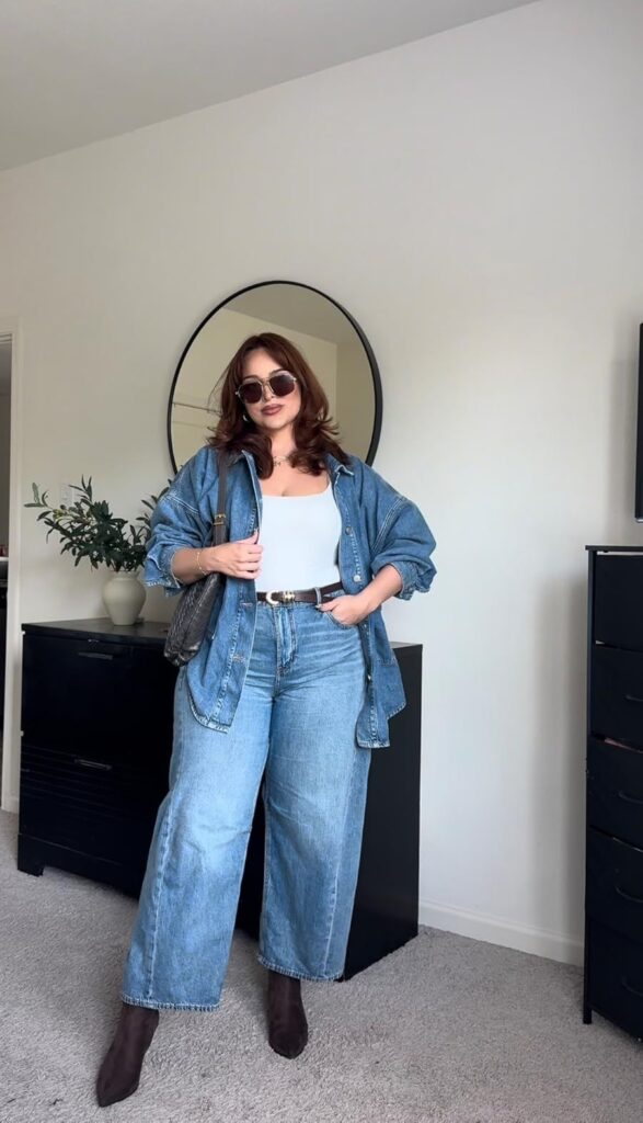 Wearing an oversized denim shirt over wide leg jeans with a white tank underneath and a belt to define the waist is so much smarter than it sounds.