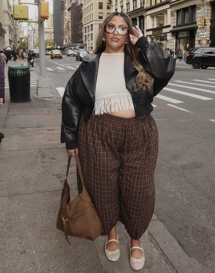 Honestly, the confidence to walk down a New York street in plaid balloon trousers with a fringed crop and a leather jacket?