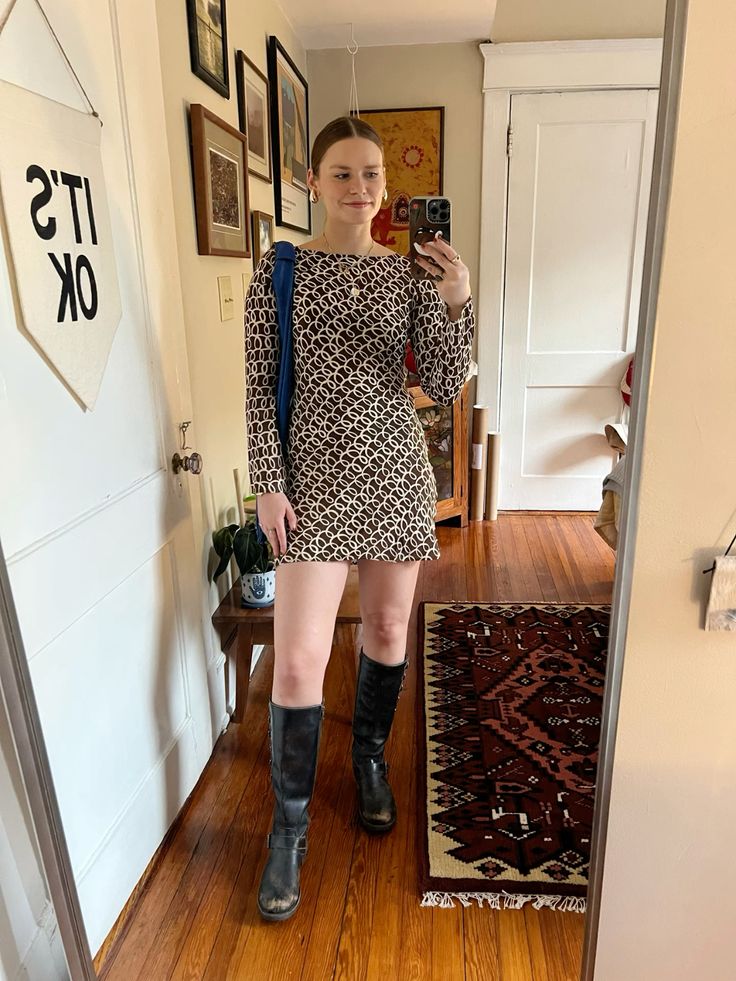 A geometric print mini dress in cream and black gains serious edge when paired with black leather knee high boots.