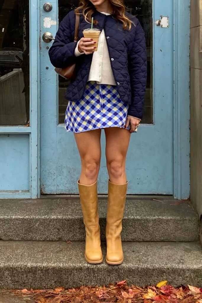 That navy quilted jacket over a cream sweater and blue gingham skirt creates such a preppy fall palette.