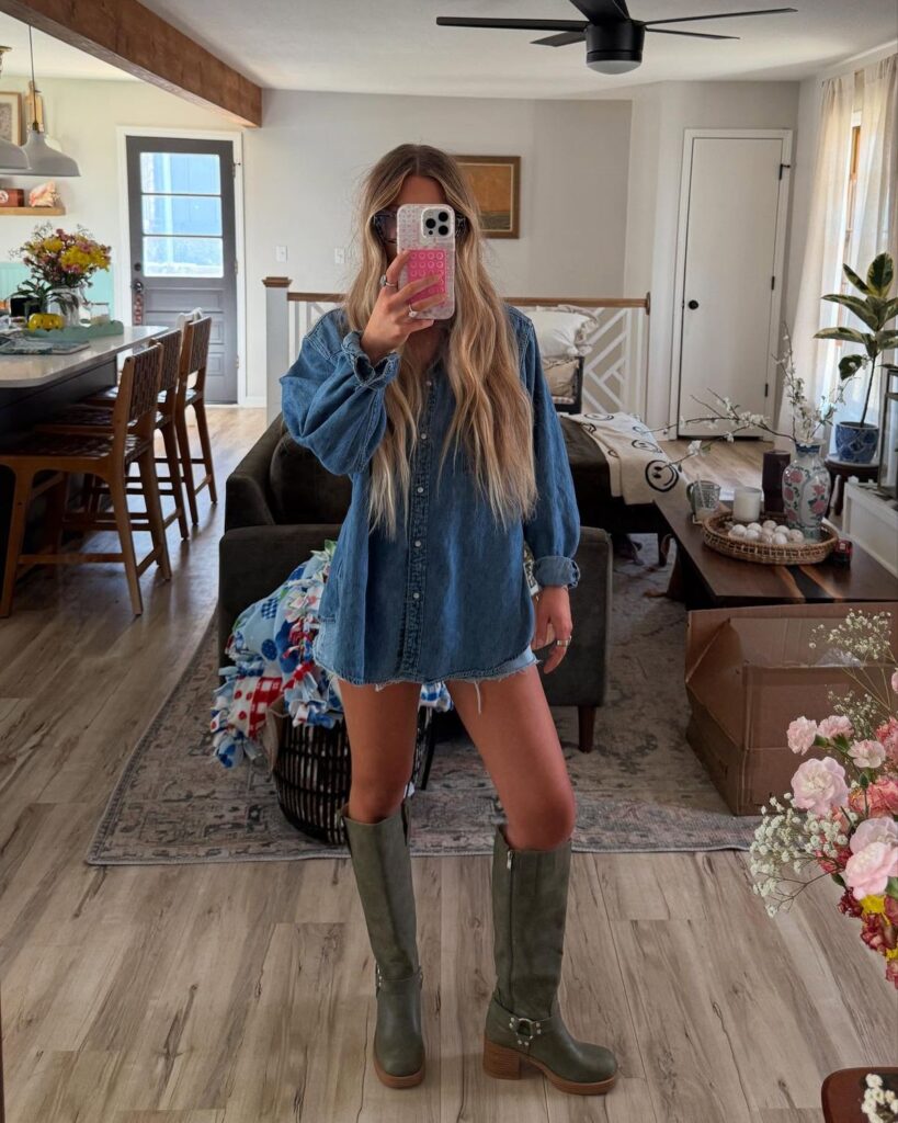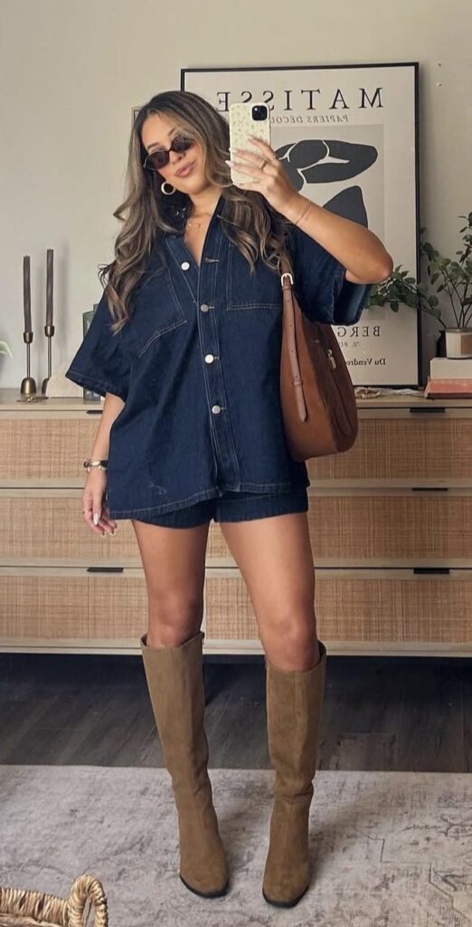 What makes this work is how the tall tan boots add structure to the soft, romantic shorts.