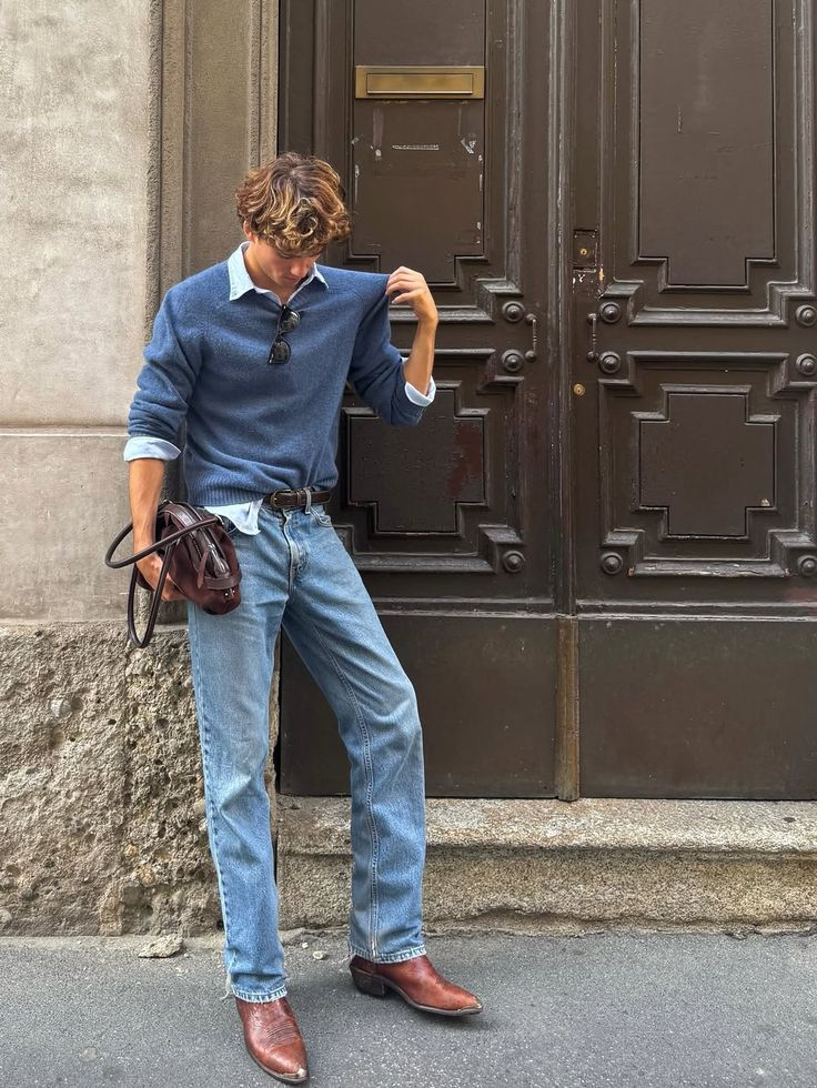 A navy knit layered under a chambray shirt creates beautiful tonal dressing in shades of blue.
