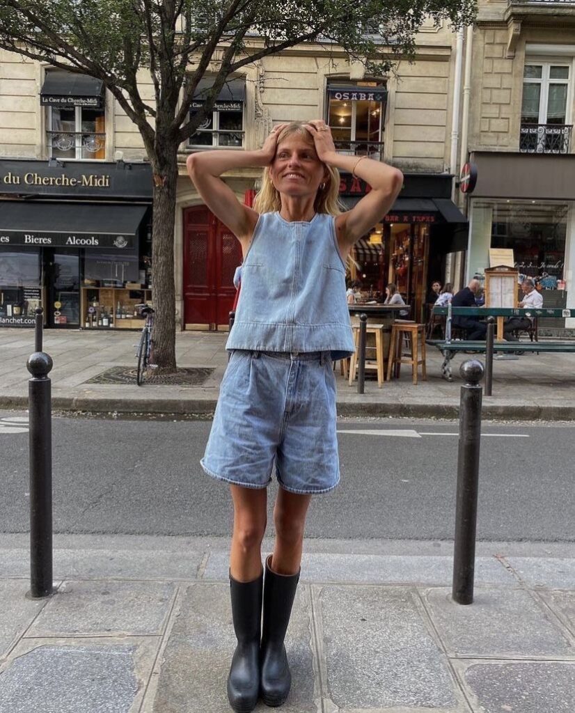 A chambray tank and matching shorts create this effortless tonal look that’s elevated by those black rubber rain boots.