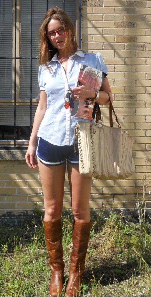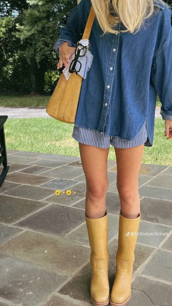 A crisp white pants outfit ideas through a light blue button down tucked into navy athletic shorts creates this preppy foundation that lets your cognac boots shine.