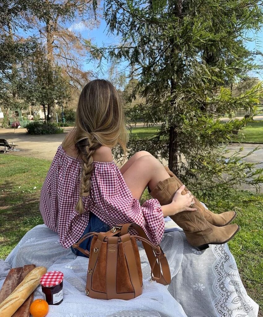 Red gingham with denim jean jacket outfits layered over? That’s your foolproof picnic uniform right there.
