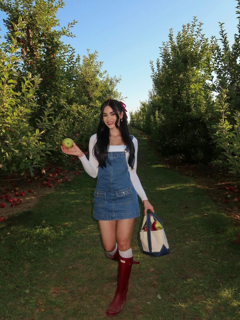 Adding those red rain boots with matching hair bow creates such a coordinated, playful energy that’s perfect for orchard days.
