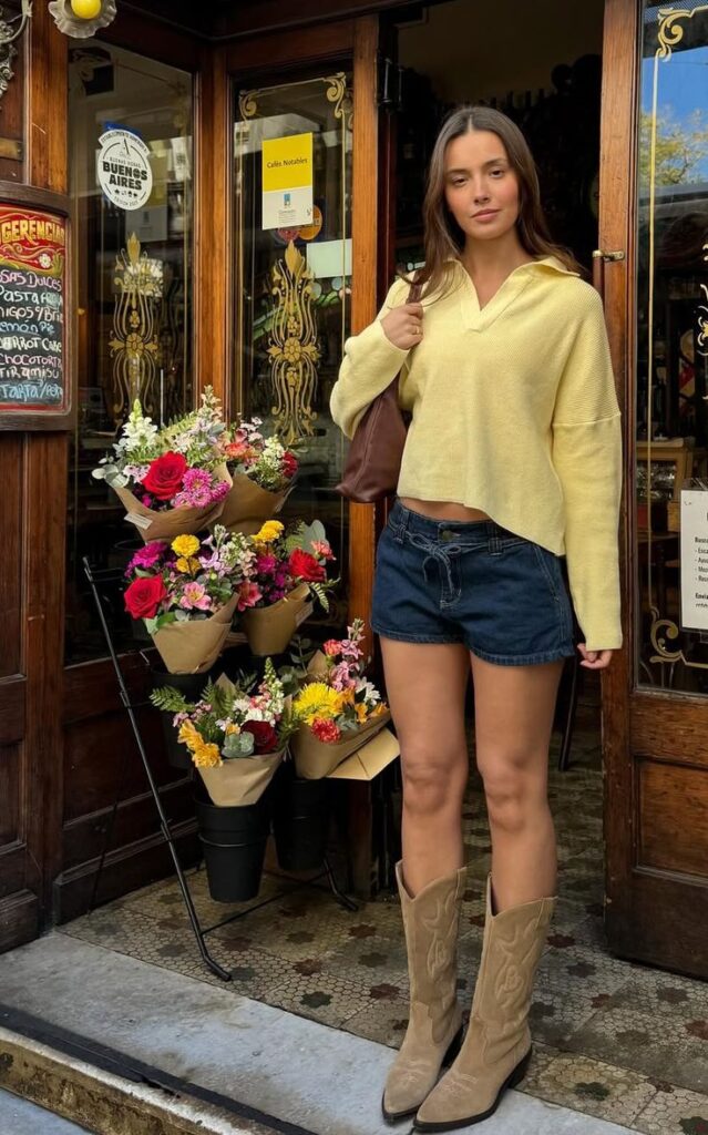 This buttery yellow knit against denim shorts outfit ideas creates such a warm, approachable vibe that feels perfect for fall transitions.