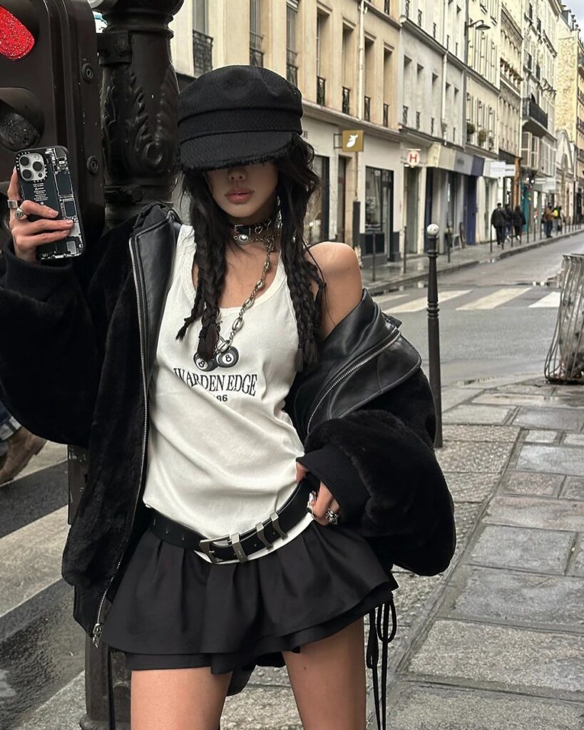 Everything about this look demands attention and gives zero apologies for it. A white graphic tank, a voluminous pleated micro skirt cinched with a studded belt, a leather shearling jacket draped off one shoulder, choker necklaces stacked up, a baker boy cap pulled low. The accessories alone are a whole conversation. This is for the girl who knows that more is more when you actually know what you’re doing.