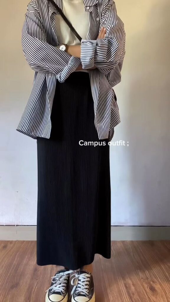 Striped oversized shirt thrown over a cream ribbed top with a fitted black ribbed maxi and Converse. It is giving student who definitely has their life together more than you do. The texture mix between the striped outer and the ribbed skirt is so subtle but so smart. I mean nobody taught you this, you just knew. Crossbody bag finishes it without overthinking.