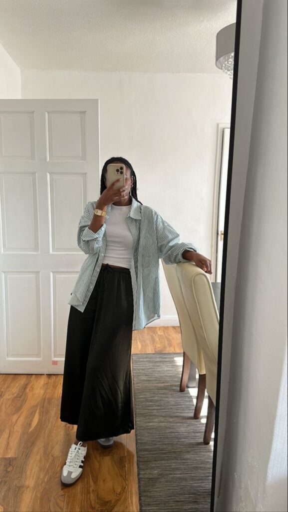 Oversized striped shirt left open over a fitted white tank and a fluid black maxi skirt with clean white sneakers. I mean, it sounds simple but it lands so well. The proportions do all the work. Layering an open shirt over a skirt instead of tucking anything in keeps it relaxed without looking sloppy. Honestly the gold watch and braids just seal the whole thing.
