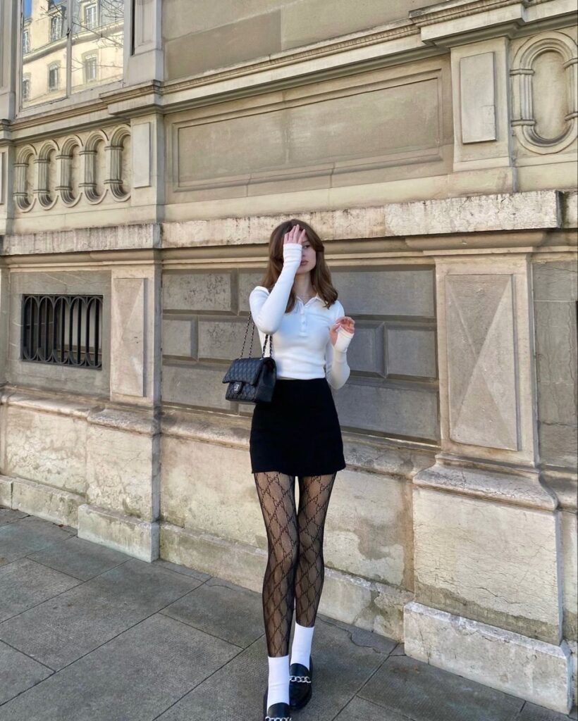 The white fitted polo top is cute on its own, sure. But the patterned sheer tights underneath the black mini are literally the whole outfit. That single accessory decision elevates everything so dramatically. White socks over the tights with loafers and a quilted chain bag completes this Parisian cool girl moment so well. Honestly, you ought to rethink how much power your legwear actually has.
