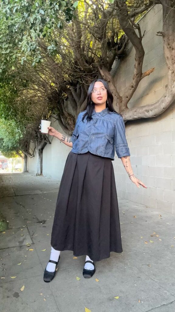 That cropped denim jacket is carrying so much character all on its own. Structured, a little retro, with just enough feminine flair in the collar. Worn over a full black pleated skirt with white socks and black mary janes while holding a coffee? So delightfully unbothered. This look hits that sweet spot between put together and effortlessly cool that everyone is honestly chasing.