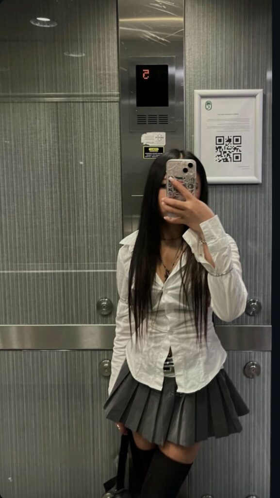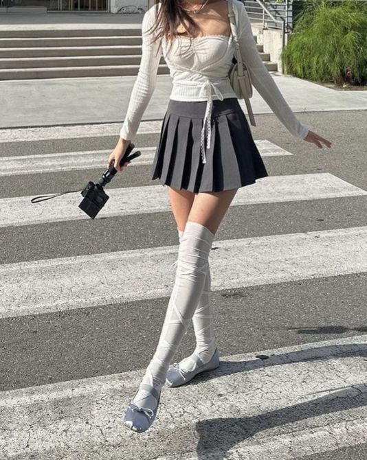 Open white button down over a layered satin inner, grey pleated micro skirt, layered necklaces and knee high boots. This look has a whole storyline. It gives night out energy with that effortless undone quality that takes actual skill to pull off. The slightly open shirt and the contrast of delicate jewellery against the boots? Sooo good. This is the one you wear when you want people to wonder about you.