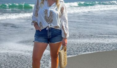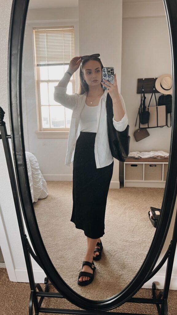 White linen shirt unbuttoned over a fitted inner, worn with a sleek black midi and chunky buckle sandals. Sunglasses perched on the head, black tote slung over one shoulder. So clean, so put together, so the kind of outfit you look back on and think yeah, I had it that day. For anyone who says minimalism is boring, this is the rebuttal.