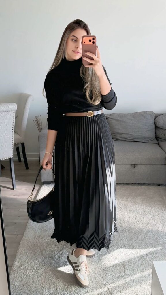 So this look is technically simple but there is one genius move happening. A black ribbed turtleneck cropped right above a tan belt cinching a graphic pleated midi skirt. That one warm toned belt against all that black is such a clever contrast. White Sambas and a black shoulder bag round it out. I mean it looks polished without being stiff, casual without being careless. Honestly that belt is the whole key.