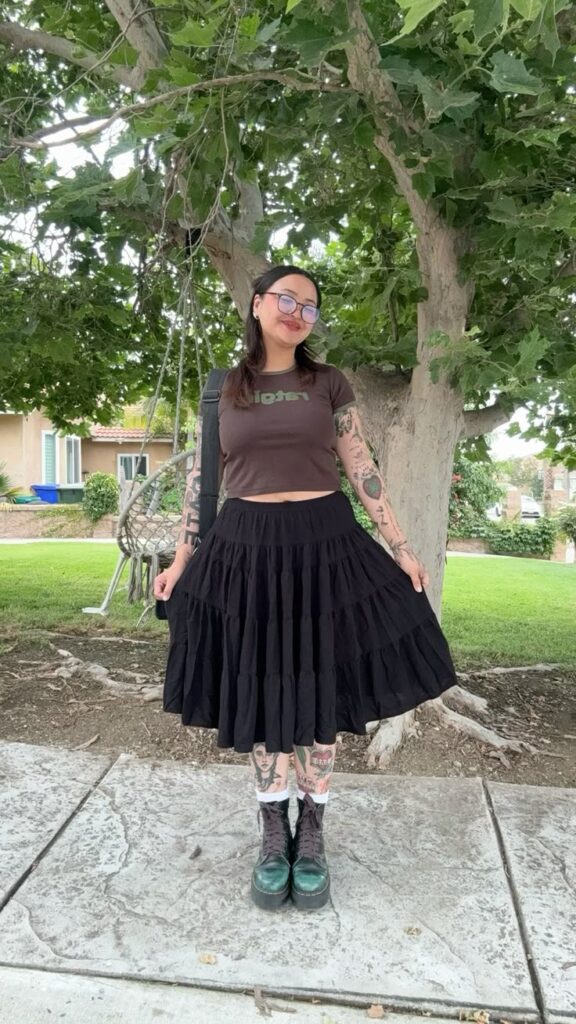 Brown and black? Yes, always. The graphic baby tee grounds this tiered midi skirt in something real and lived in, you know, like you thrifted both pieces and somehow nailed it. Green platform boots with white socks peeking out basically make the whole look. So good for a casual day out when you want just enough edge without overdoing it.